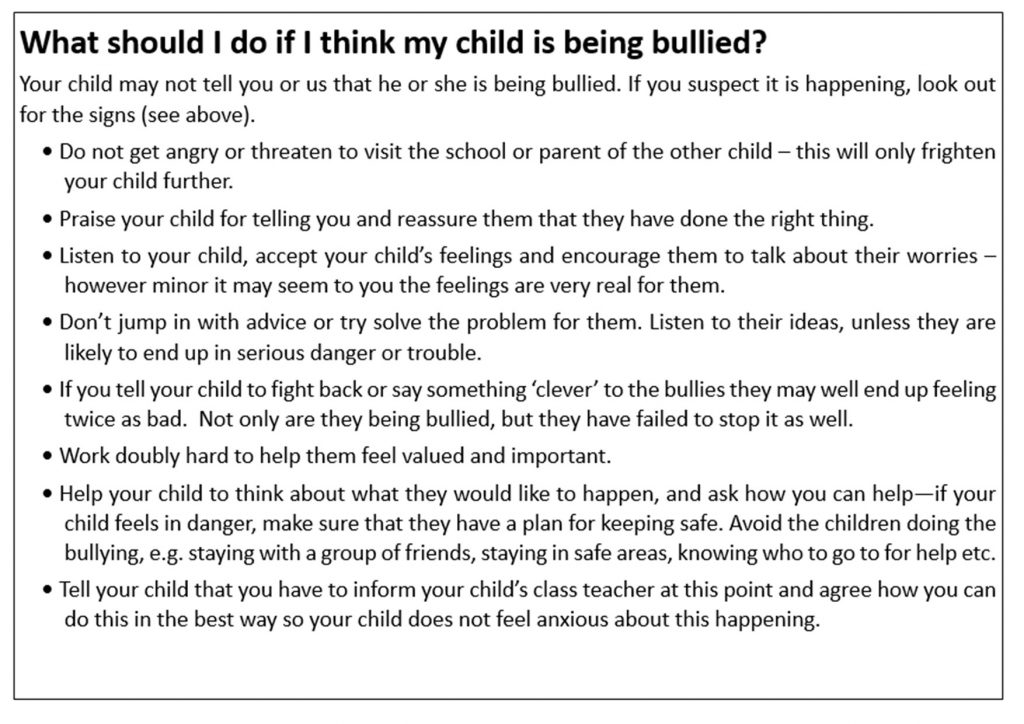 Please read our Parent/Carer information leaflet if you have any concerns about bullying in school: Bullying Advice Leaflet for Parents and Carers