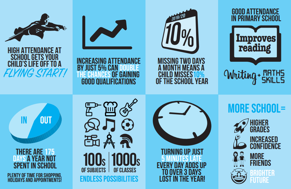 The attendance Officers have created an Attendance Leaflet for Children. This has been shared with all pupils and is on display around school.