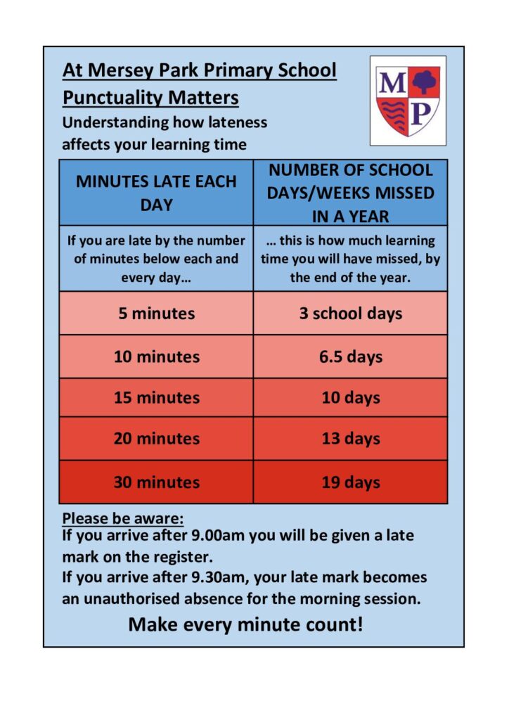 Please click here to see what good punctuality means at Mersey Park Primary School.