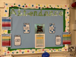 - In each classroom there is a display that shows weekly attendance. Rewards are given for 100% attendance for the week and improvement.