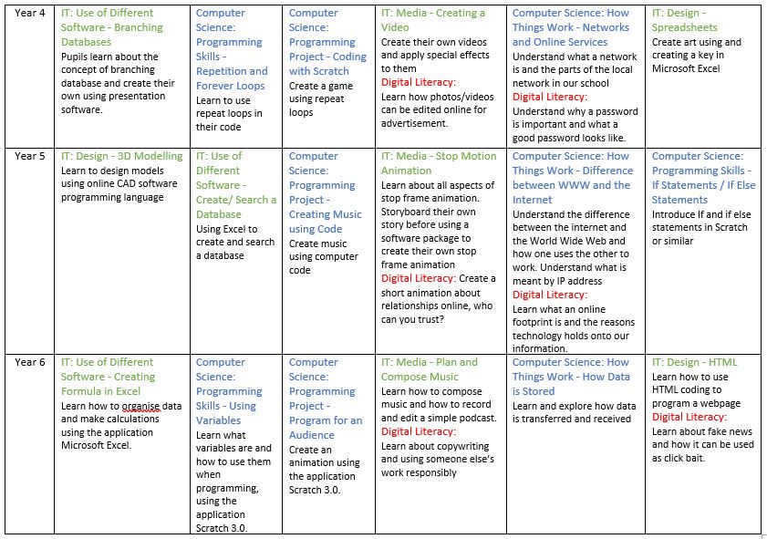 In Year 6 the children use laptops; log on, create and edit their work. The children create their own music track by mixing samples with new FX and multiple layers. The children use Audacity to combine tunes and record their own voice to add to a track. During Safer Internet week the children take part in workshops and activities to ensure the key messages are understood and that the children are able to implement them when necessary.