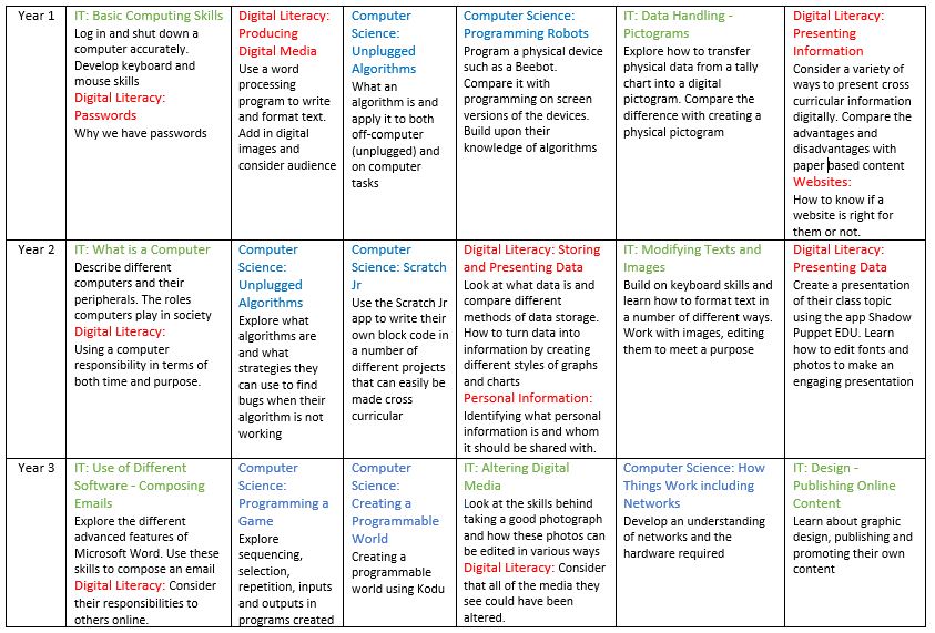 In Year 3 the children will explain why they use technology in the classroom, in their homes and in the community and their benefits. They will identify components of a computer and identify what each of these components does. The children also combine a mixture of text, graphics and sound to produce online content. They use a keyboard with more confidence and be able to effectively use a spell checker. They develop an understanding of how to share their work online and discuss the purpose of adverts.