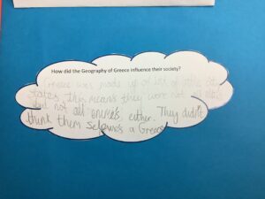 In Year 5 they start the year with their Ancient Greece topic. As part of their topic they learn about where Greece is and how the geography of Greece influenced their society. We also look at trade and how the Greeks would have had contact with other civilisations through travel.