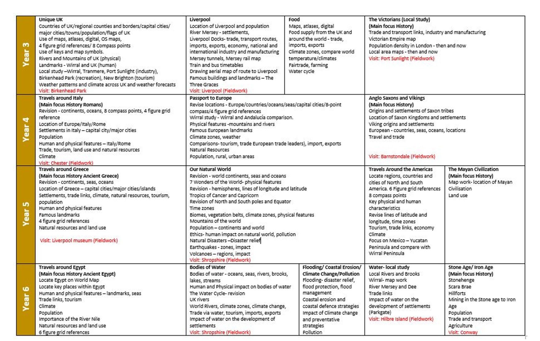 - Fieldwork opportunities are built into units of work wherever possible; pupils have opportunities across most year groups to explore their immediate locality, the Liverpool area as well as more distant places such as Malham.