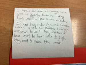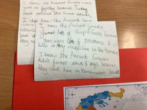 In Year 5 they start the year with their Ancient Greece topic. As part of their topic they learn about where Greece is and how the geography of Greece influenced their society. We also look at trade and how the Greeks would have had contact with other civilisations through travel.