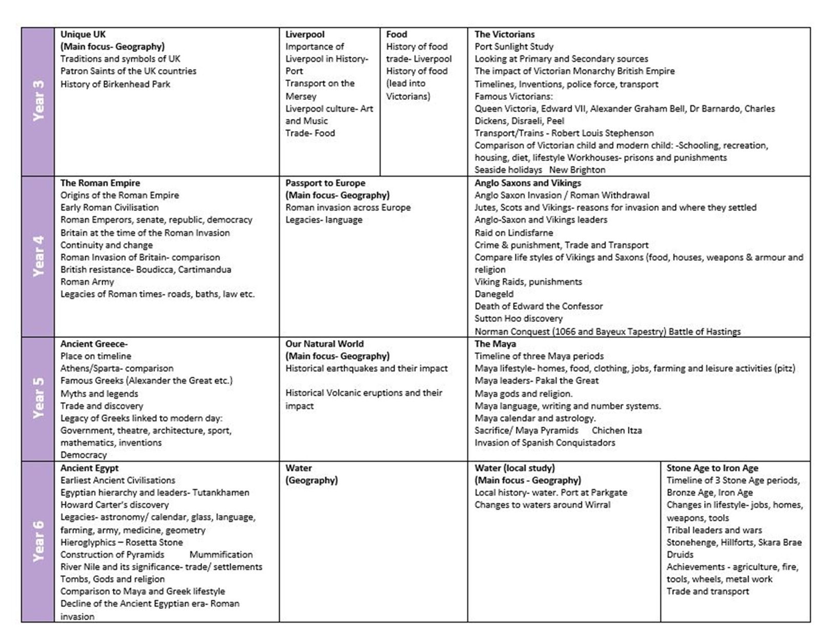 In Year 3 the children learn about the importance of the history of Liverpool as a port for trade with a focus on the import and export of food. They look at how transport on the Mersey River has changed over time. They find out about the culture of Liverpool and the impact this has had on the wider world.
