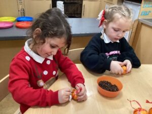In Foundation 2 the children explore and talk about how they have changed since they were babies. At Harvest time the children look at the ways crops are harvested today and through looking at images compare it to the past. The children sort toys from the past and toys today. The children compare familiar buildings in their local area. They observe the new hospital building and the old church. The children share some stories that begin to help them develop an understanding of life at Christmas time in the past. The children enjoy finding out about Christmas time in the past. They make pomanders using tangerines and cloves. They compare them to their own Christmas decorations.