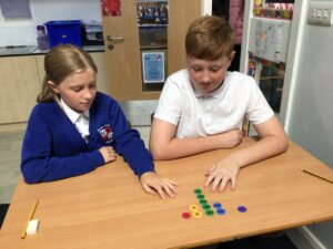 In Year 1, the children continue to develop their addition and subtraction skills. They also introduce multiplication by counting in 2s, 5s and 10s. They explore problems using concrete manipulatives and move onto pictorial and abstract representations, such as number sentences. The children also explore place value and begin to partition and combine into tens and ones, using dienes material to support this.