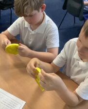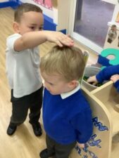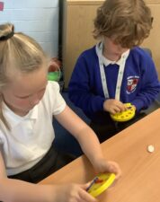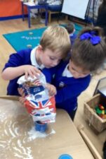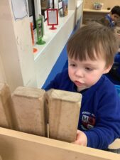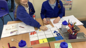 In Foundation 2 the children begin to follow the Power Maths Programme. High quality learning environments are provided and meaningful interactions with adults, support children in developing mathematical thinking and discussion. The children learn through games and tasks using concrete manipulatives and pictorial structures and representations which are then rehearsed applied and recorded within their own child-led exploration. The children enjoy exploring shapes which can stack and roll. The children create their own patterns using paint. The children measure salt, flour and water to make salt dough. They use comparative language to describe their actions.