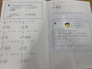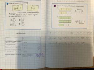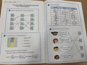 In Year 5 the children focus on fractions for the majority of the summer term. They learn how to convert mixed number fractions into improper fractions and how to add and subtract them. They have also learnt how to convert fractions into decimals and percentages. The children continue developing their wider maths knowledge by using protractors to measure angles.