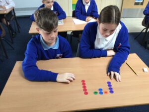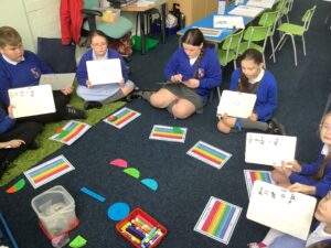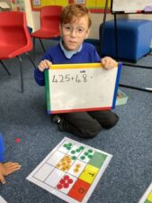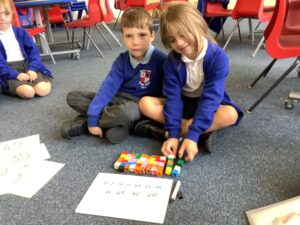 In Year 1, the children continue to develop their addition and subtraction skills. They also introduce multiplication by counting in 2s, 5s and 10s. They explore problems using concrete manipulatives and move onto pictorial and abstract representations, such as number sentences. The children also explore place value and begin to partition and combine into tens and ones, using dienes material to support this.