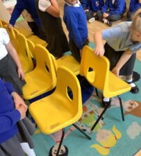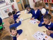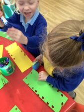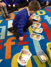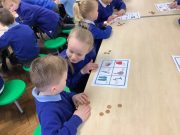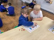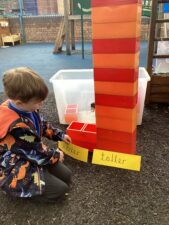 In Foundation 2 the children enjoy creating their own number track. They roll the dice and eagerly anticipate which number they will land on. The children explore height, building towers and comparing their height, using the vocabulary ‘taller’ and ‘shorter’ to describe them. They also find a selection of items from around the classroom to compare the weight of. They pretend to be a human balance first and feel which object is heavier. Then they use the balance to see if they are right. They begin to use the vocabulary ‘heavier’ and ‘lighter’. The children also enjoy making increasingly complex patterns and describing them to their friends.