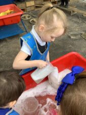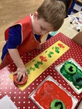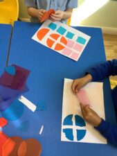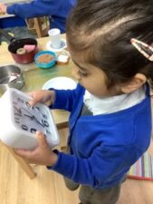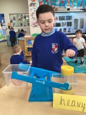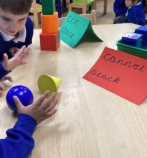 In Foundation 2 the children begin to follow the Power Maths Programme. High quality learning environments are provided and meaningful interactions with adults, support children in developing mathematical thinking and discussion. The children learn through games and tasks using concrete manipulatives and pictorial structures and representations which are then rehearsed applied and recorded within their own child-led exploration. The children enjoy exploring shapes which can stack and roll. The children create their own patterns using paint. The children measure salt, flour and water to make salt dough. They use comparative language to describe their actions.