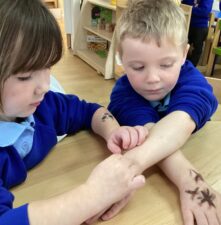 In Foundation 2 children develop their understanding of the differences between people and begin to learn that people have different beliefs and celebrate special times in different ways. The children learn about the festival of Diwali and make their own diva lamps. They also use henna to create mehndi patterns on each other’s hands. They visit St. Catherine’s church and learn that it is a special place to some people.
