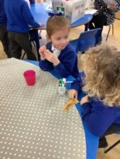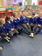 In Foundation 1 there are many opportunities for the children to practice their speaking and listening skills through the use of nursery rhymes, performance activities and shared tasks. It can be noisy in Foundation 1 sometimes but that is because they are always talking to each other about their learning.