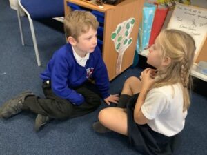 In Year 2 the children use think, pair, share as a technique to build their original ideas. This ensures the children are able to think of an idea, then have time to pull their thoughts together before presenting it to the class. They use carpet sessions and teamwork regularly to continue to build up their vocabulary and encourage them to become confident speakers. Across all subjects they are given time to speak together and are actively encouraged to listen to their peers ideas too.