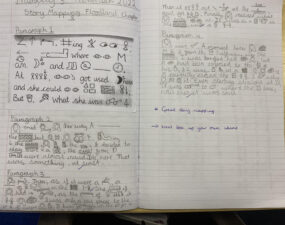 In Year 1 the children continue to develop their knowledge of stories through reading and enjoy retelling them using Talk for Writing techniques such as food tasting, short burst writing and adding actions to the stories. This encourages the children to include plenty of story structure in their story maps and when they write their new stories. The children then use all this knowledge to create their own versions of the stories.
