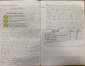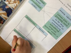 In Year 5 the children read Ancient Greek myths from our History Topic. They act out Perseus and Medusa in small groups to help build their vocabulary and prepare them for writing. The children continue to develop their Talk for Writing skills by: discussing the themes and conventions of the myths they’ve read; short burst writing where they describe the main characters and then by creating a story map with actions. Once the children fully understand the myth, they then write their own version using the original myth as inspiration. Once this process is completed, the children use boxing up skills to change elements of the myth i.e. the main characters/settings in order to write their own innovated myth.