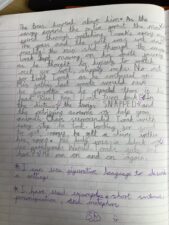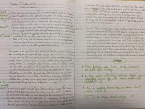 In Year 6 the children study the book ‘Skellig’ by David Almond. They start the book and use ‘Talk for writing’ to re write an extract. They then innovate the extract and write their our own story as a narrative. They include direct speech and different sentence types to create atmosphere within their writing.