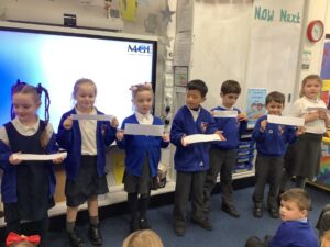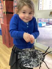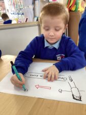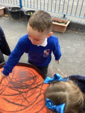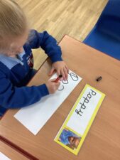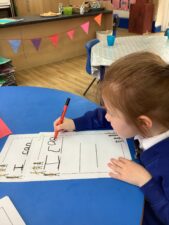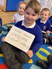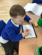Early writing begins in F1 where children are encouraged to make marks which they start to give meaning to. They are provided with a wide range of stimulating equipment to encourage make making such as large brushes with paint or water and dragging streamers through puddles. Once large muscles co-ordination is well developed children begin to develop small muscle co-ordination using chalk, pencils and felt pens. As children’s marks develop they are motivated to write in a wide range of ways through carefully planned opportunities for writing e.g. chalking on paving stones, boards and notepads in the home corner. They begin to use some of their letter knowledge in their writing. This usually begins with letters from their name and progresses on to children using known letters for the initial sound in words. As their phonic knowledge increases they begin to segment simple words (vc/cvc) to spell. When the children are able to spell simple words they are introduced to how sentences are structures. The idea of Talk for Writing is used to develop simple story structures, embedding key vocabulary and developing independent writing confidence.