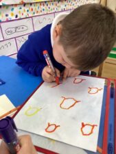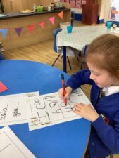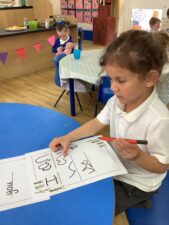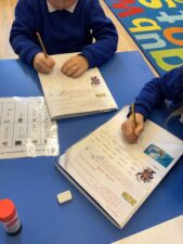 In Foundation 2 the children continue to build on their love of books and stories. The children continue to develop their mark making skills by practising letter formation, using the letter sounds to write words and build these into sentences.