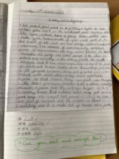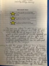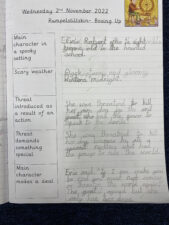 In Year 6 the children study the book ‘Skellig’ by David Almond. They start the book and use ‘Talk for writing’ to re write an extract. They then innovate the extract and write their our own story as a narrative. They include direct speech and different sentence types to create atmosphere within their writing.