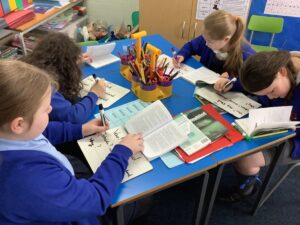 In Year 6 the children study their literacy spine novel ‘Skellig’. The children look at mystery items in a box to look for clue about what the story is about. They then make further predictions about the story from a variety of different book covers. The children write a newspaper report about the finding of Skellig and a non- chronological report about owls.