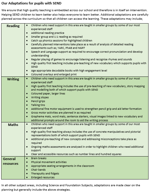All pupils in school receive quality first teaching. This means that a range of teaching and learning styles are used and that appropriate learning objectives are set for all children with a curriculum adapted to meet their needs. All our classes are supported by teaching assistants and pupils are also offered additional one to one tuition, small group work or catch up programmes where needed. Through appropriate curricular provision, we respect and acknowledge that children: