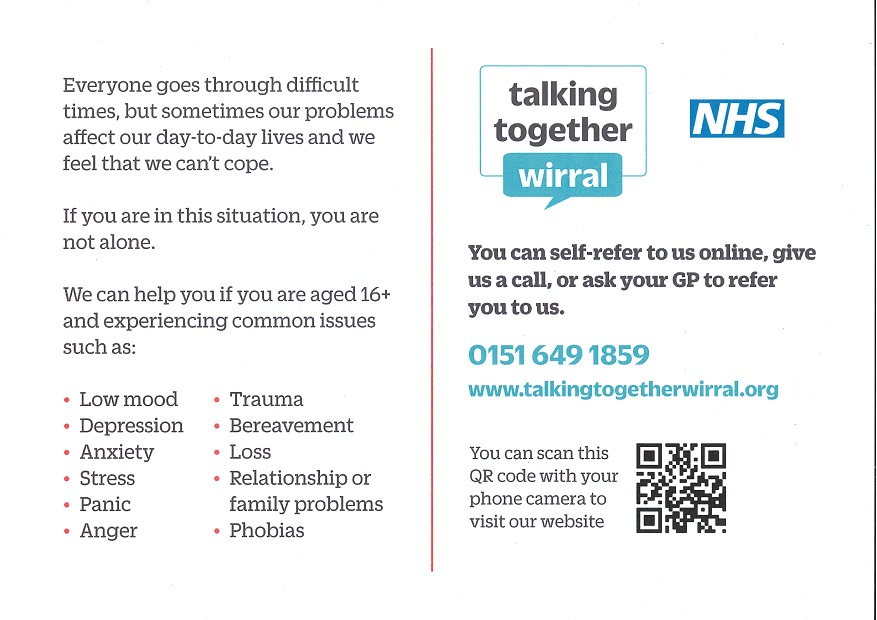 NHS Wirral Talking Therapies is a free and confidential service, available to anyone who is aged 16+ and registered with a GP in the Wirral.